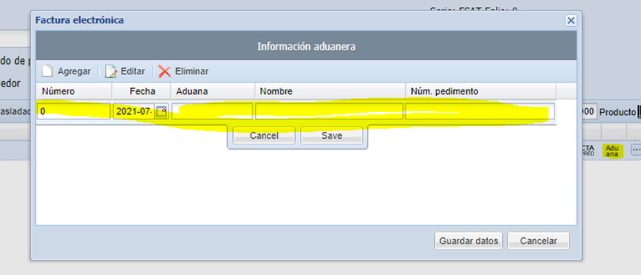 - En caso de que la factura sea sin impuestos se debe agregar los datos de aduana por renglón de producto (fecha, aduana, nombre y núm pedimento).