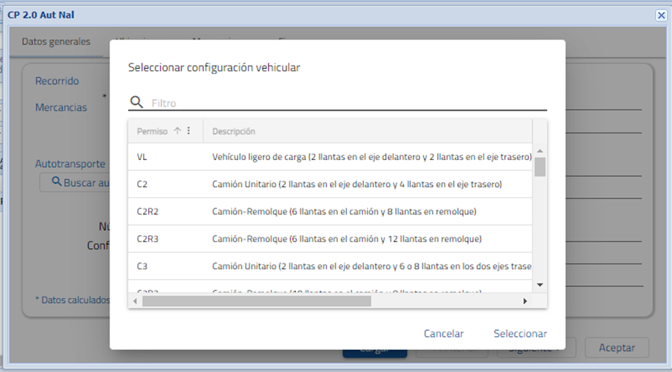 - Configuración vehicular: clave de la nomenclatura del autotransporte (Valor del catálogo c_ConfigAutotransporte).