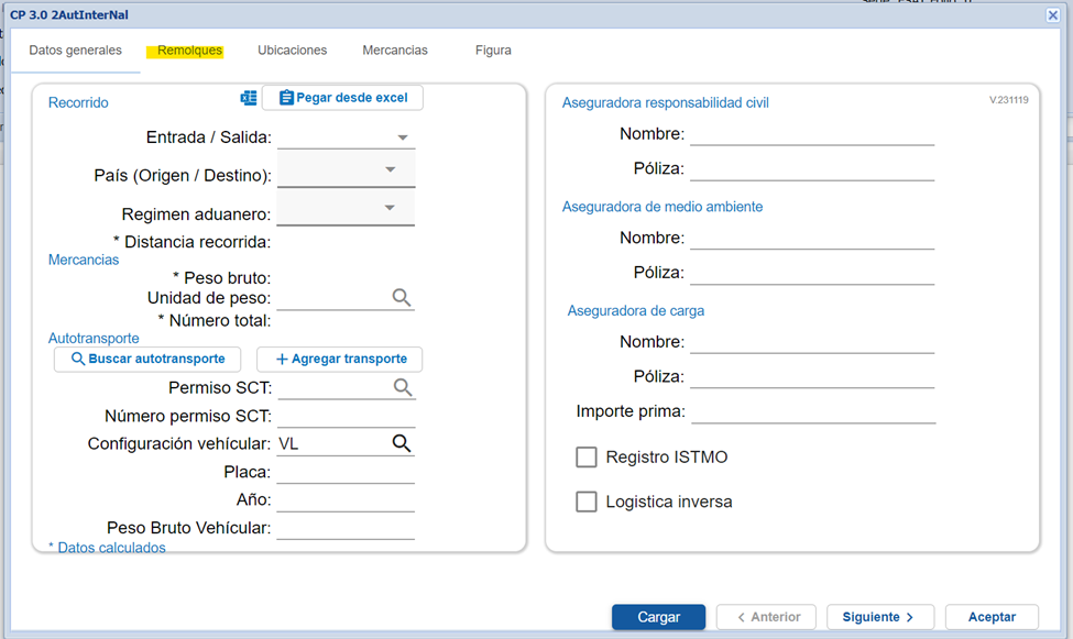 - Aseguradora riesgos de carga: Atributo opcional para registrar el nombre de la aseguradora que cubre los riesgos de la carga