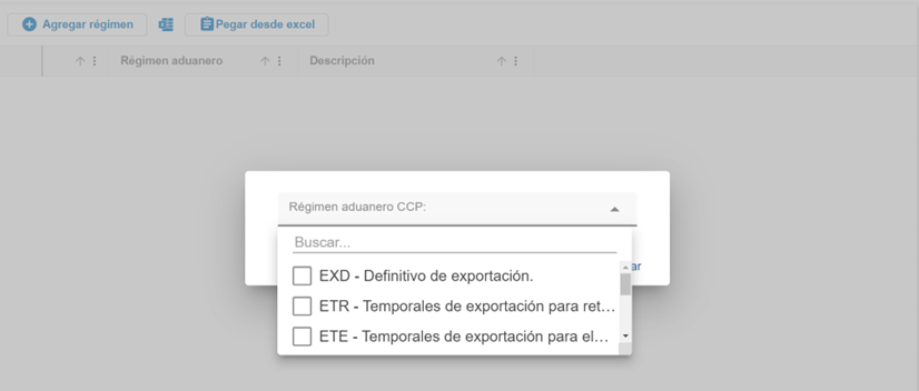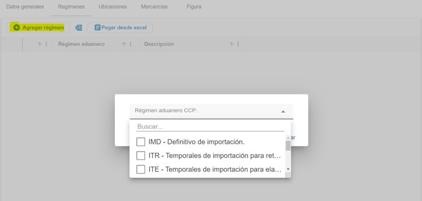 Al seleccionar agregar régimen aduanero el sistema desplegará el catálogo dependiendo del tipo que se trate (Entrada o Salida). Se pueden agregar de 1 y hasta 10.