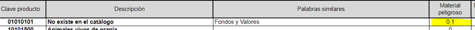 - Material Peligroso: Se aceptan los valores Sí y No, se agrega el valor “Sí” cuando la mercancía transportada, dentro del catálogo, c_ClaveProdServCP en la columna material peligroso tenga el valor 1, en caso de que la mercancía transportada, dentro del catálogo, c_ClaveProdServCP en la columna material peligroso tenga el valor 0 y 1 se pueden agregar los valores “Sí” o “No” y si la mercancía transportada, dentro del catálogo, c_ClaveProdServCP en la columna material peligroso tiene el valor 0, el campo se deja vacío.