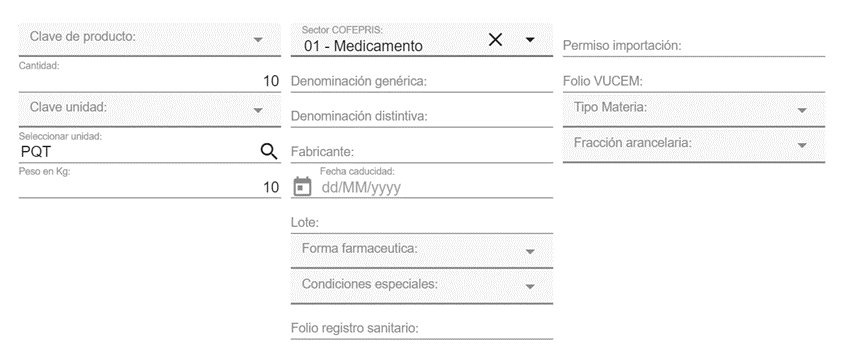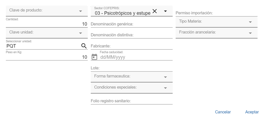 - Caducidad: se debe registrar cuando el sector cofepris sea 01, 02 o 03, es la fecha de caducidad del medicamento, psicotrópico o estupefaciente; o para expresar la fecha de reanálisis del precursor o químico de uso dual.