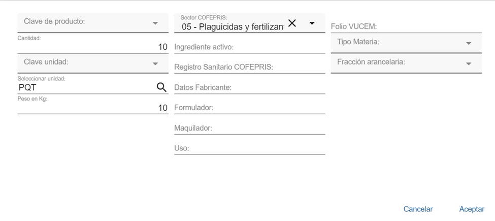 - Maquilador: Se debe registrar cuando el sector cofepris sea 05, es el país y nombre o razón social de quien maquila el ingrediente activo del plaguicida o fertilizante.
