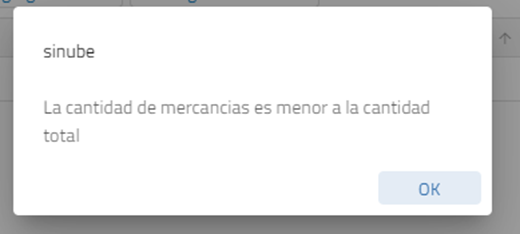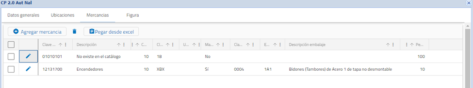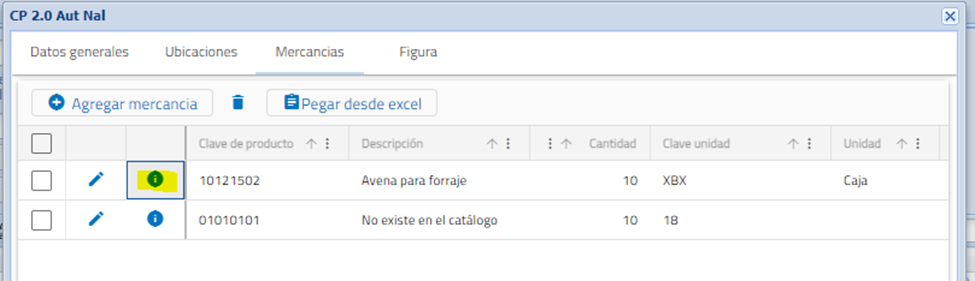 Si se necesitan editar estos datos, dentro de la ventana de mercancías aparece el icono con un signo de admiración.