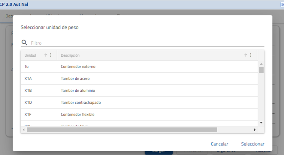 - Unidad de peso: Atributo requerido para registrar la clave de la unidad de medida estandarizada del peso de los bienes.(Valor del catálogo c_ClaveUnidadPeso).