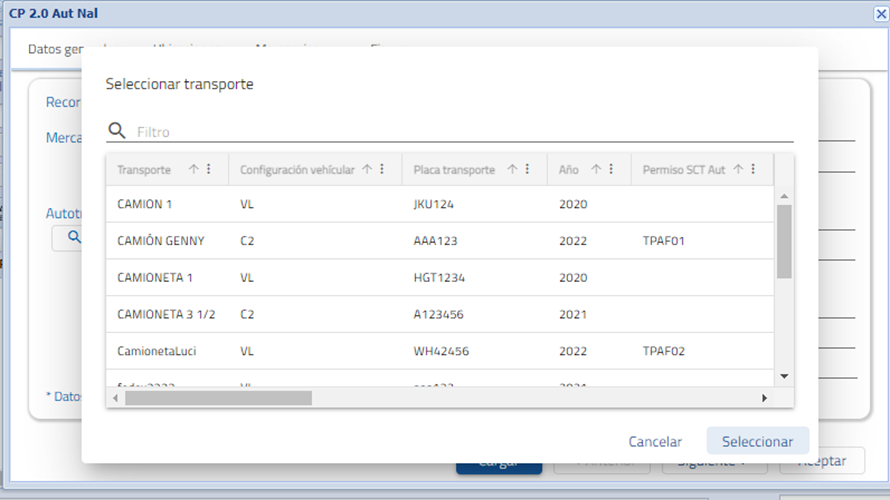 - Buscar autotransporte: esta opción nos remite al catálogo Addenda Transporte desde el cual podremos seleccionar una opción; dicho catálogo debe ser alimentado con anterioridad.