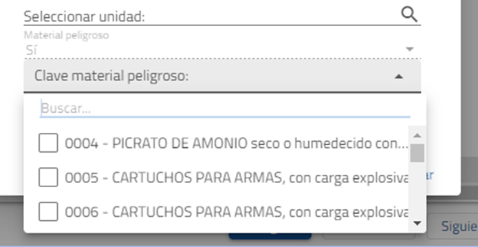 - Clave Material Peligroso: clave del tipo de material peligroso que se transporta.(Valor del catálogo c_MaterialPeligroso).