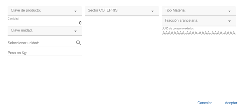 - Descripción Materia: Este campo debe ir vacío excepto si se elige la clave 05 del catálogo c_tipoMateria en el campo Tipo Materia.