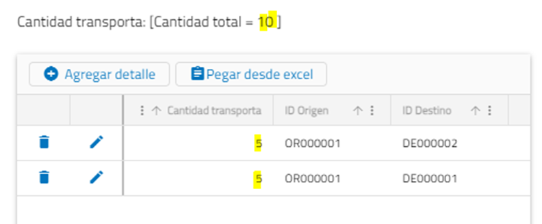 - Cantidad Transporta: Cantidad de mercancías que se transportan hacia el destino agregado en ID destino.