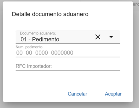 - Pedimento: Número de Pedimento, debe cumplir con el mismo patrón con el que se registra en el CFDI y sólo se agrega en caso de haber seleccionado la clave 01 en el campo de documento Aduanero.