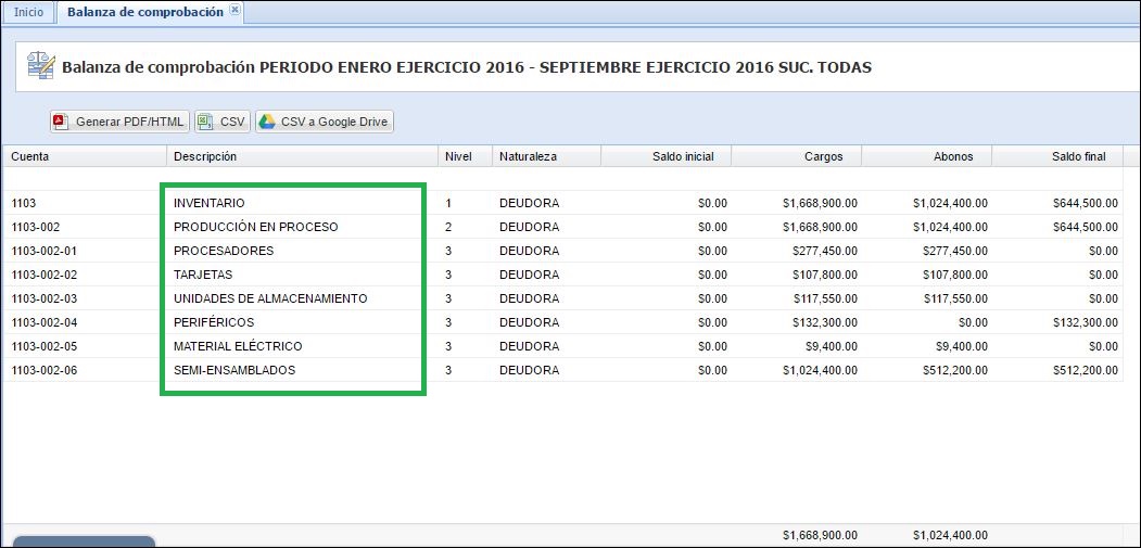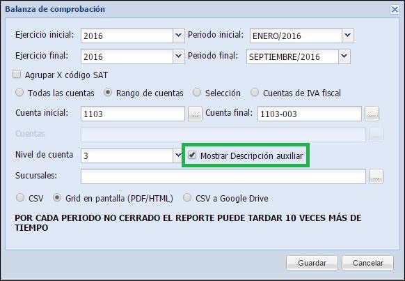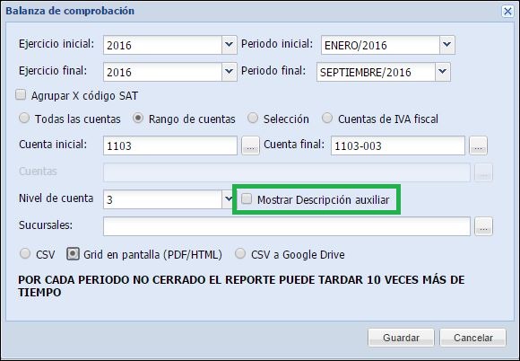 Al generar los reportes Balance general, Balanza de comprobación, Estado de resultados y Sustitución Contable, sí se tiene marcada ésta opción, en el reporte aparecerá como descripción de la cuenta, la Descripción auxiliar.