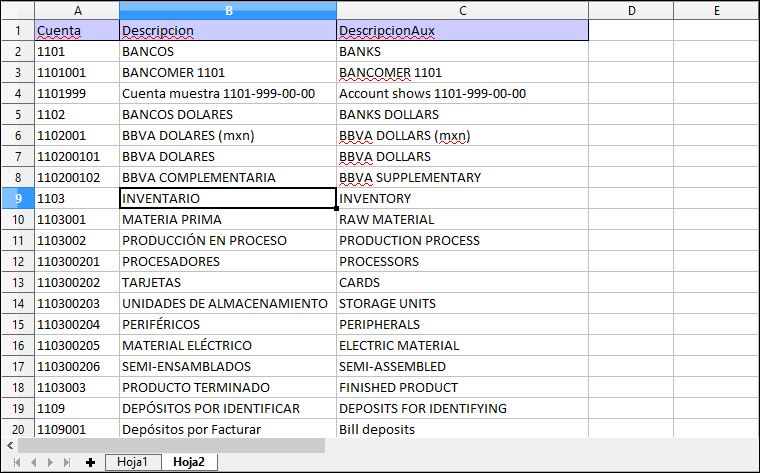 Ésta descripción es opcional y se puede actualizar de forma manual en el catálogo contable o pegándola desde Excel, y la plantilla de Pegado de cuentas ya incluye la columna DescripcionAux.
