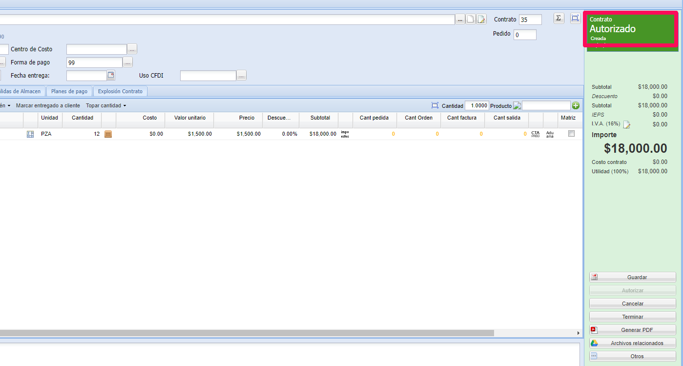 Dentro del contrato, es posible generar un apartado para salidas de almacén y facturas, el proceso es el siguiente: