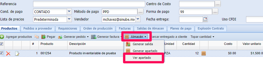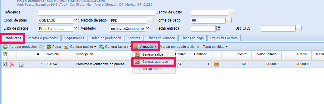 2.- Desde la pestaña Productos, del menú Almacén, utilice la opción Generar apartado: