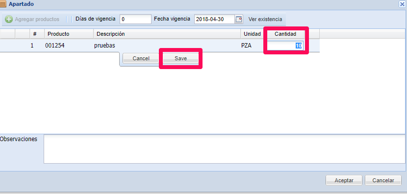 3.- En la siguiente ventana, haga doble clic sobre el renglón del producto para editar la cantidad y presione Save: