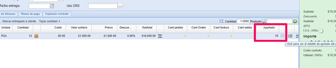 5.- Con la opción Ver apartado, aparecerá la columna Apartado, que mostrará la cantidad apartada del producto, el icono de la derecha le indica la cantidad y el estatus