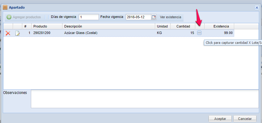 En el caso de apartar productos que utilizan Lote/serie, es necesario indicar el lote y/o la serie que se aparta: