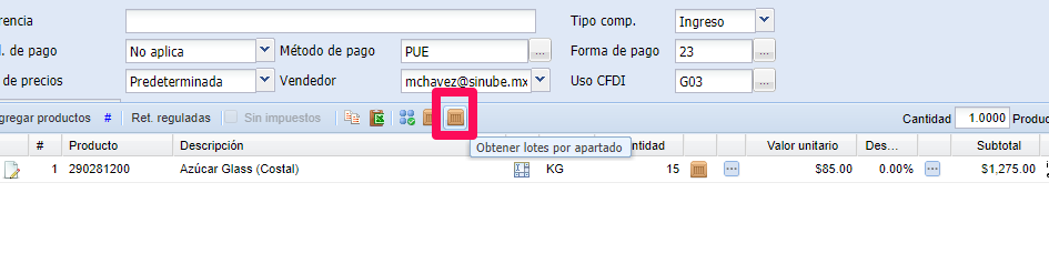 Al momento de facturar, o de hacer la salida de almacén, presione el botón Obtener lotes por apartado, el sistema tomará justamente las unidades del lote/serie apartado: